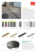 Im ACO Self® Baukasten passen alle Rostabdeckungen auf alle Rinnenkörper. Für die Abdeckungen stehen verschiedene Materialien zur Auswahl, von verzinktem pulverbeschichtetem Stahl über Edelstahl und Guss bis hin zu Kunststo . Die Rinnenkörper sind aus Polymerbe- ton oder Kunststo und im Bereich der Fassadenrinne aus Edelstahl oder Stahl verzinkt erhältlich. Die ACO Self® Flachrinne findet Anwendung in Bereichen mit geringen Aufbauhöhen. Mit der ACO Self® Highline für Balkone und Terrassen ist Fassadenentwässerung durch ein o enes Rinnensystem über zwei Ebenen möglich.